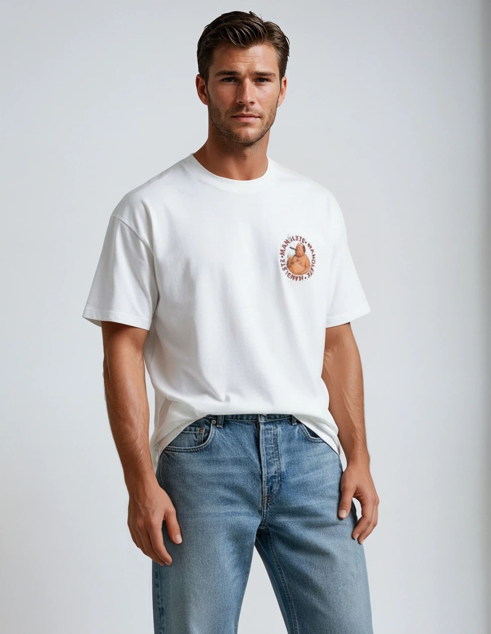 - Camiseta de corte oversize, confeccionada con algodón premium de 200 g/m². Para que le quede amplia y holgada, se recomienda escoger una talla más a la habitual.